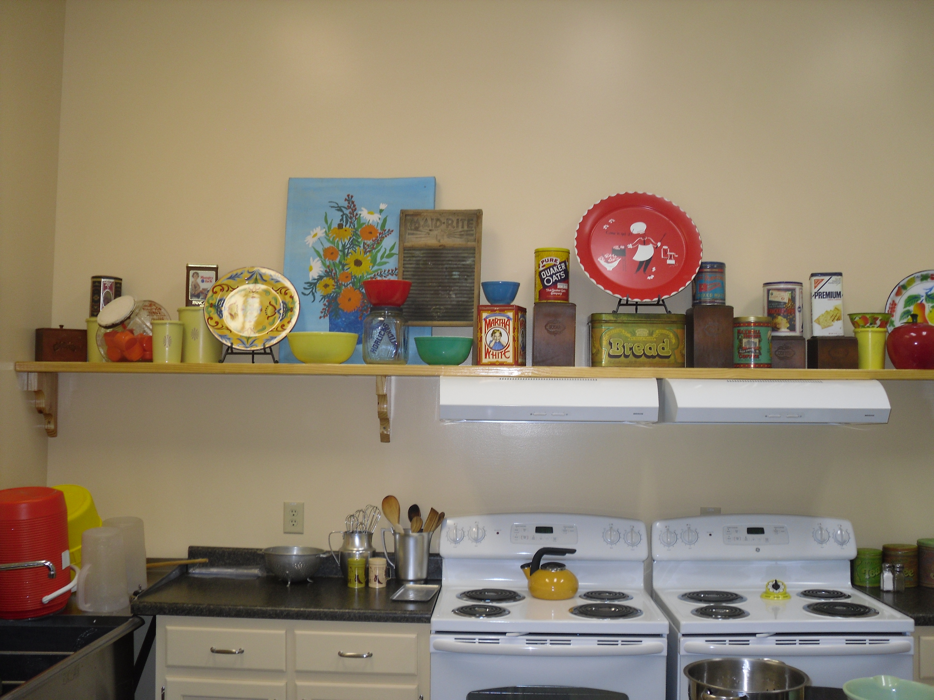 The tree house kitchen doesn’t have a window, so I wanted to add some color with vintage tins and funky platters. Hello 24 foot ceiling.