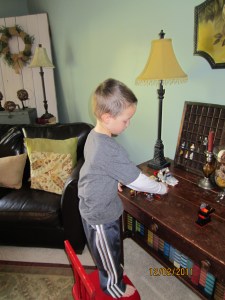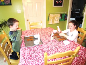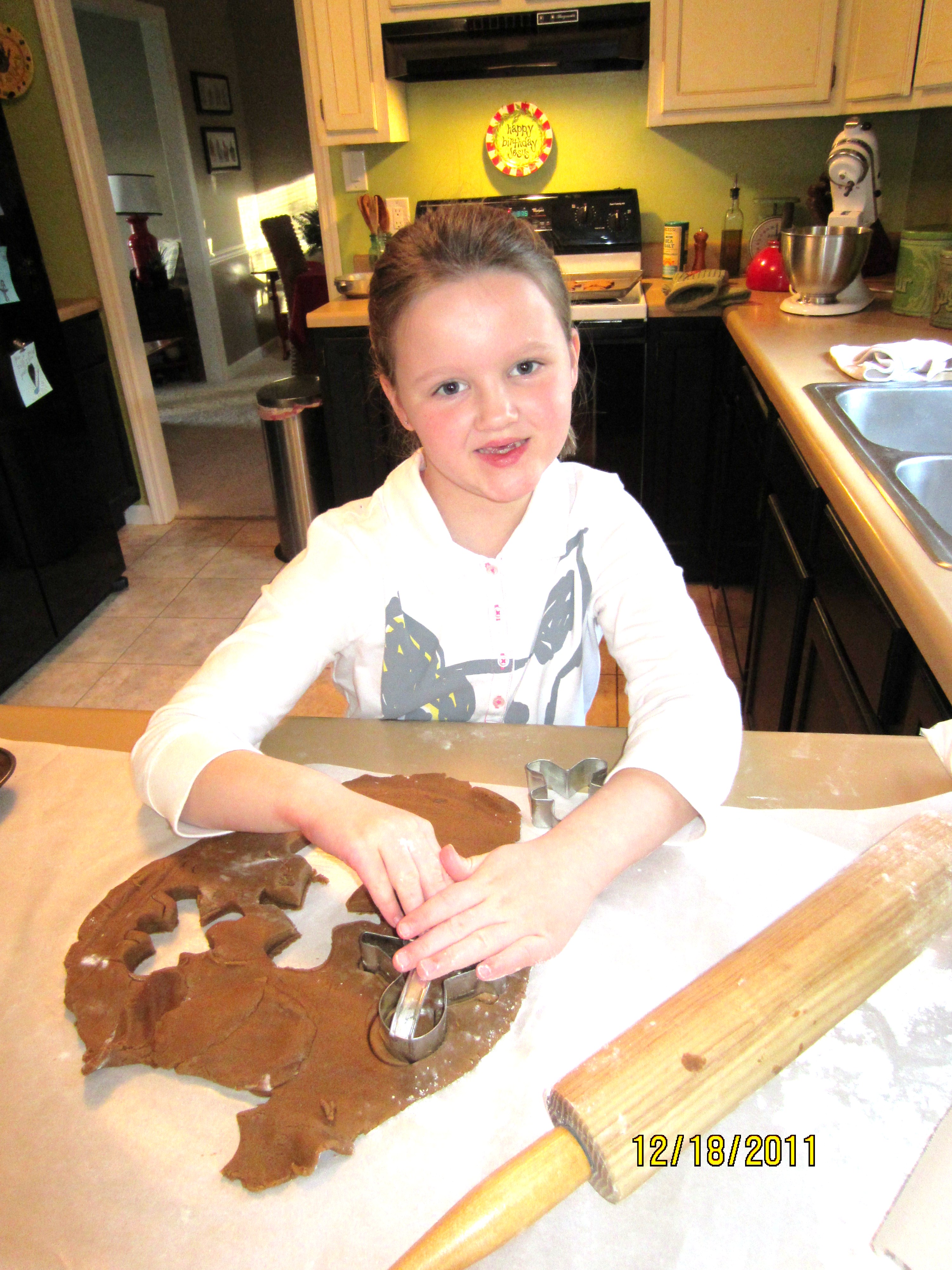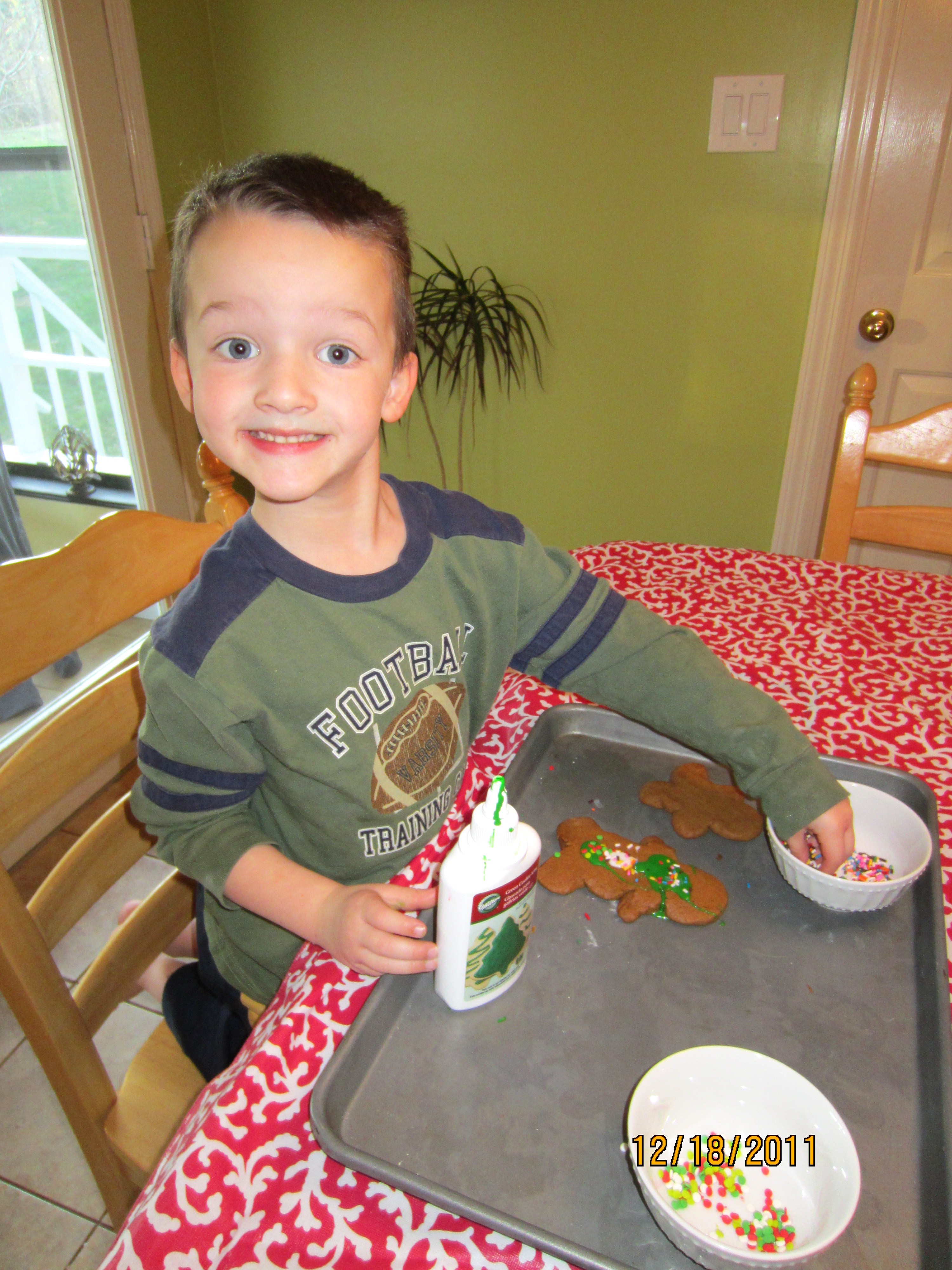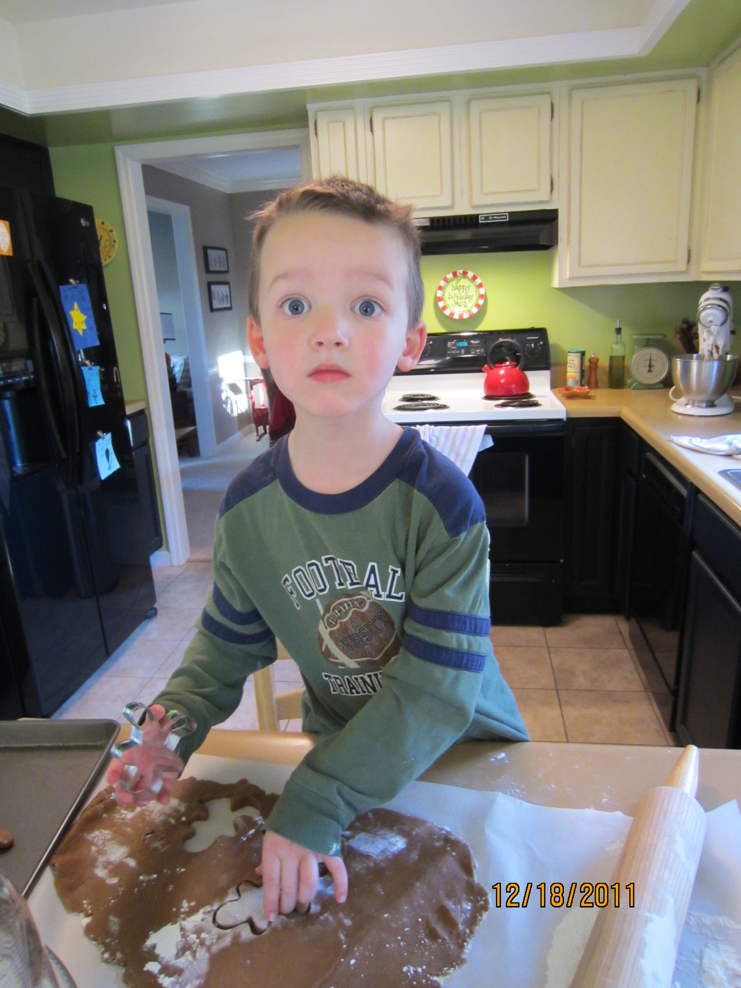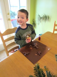 I decided to let each child make a batch of gingerbread today (not supermom, I just couldn’t handle the fighting so I divided and conquered). This is G’s face when I told him to watch out for run away gingerbread men.