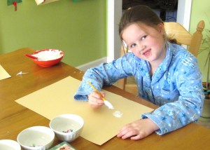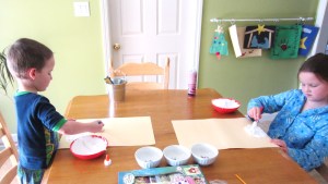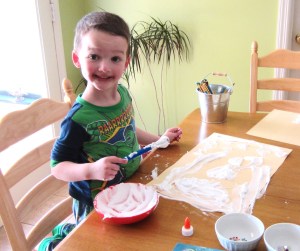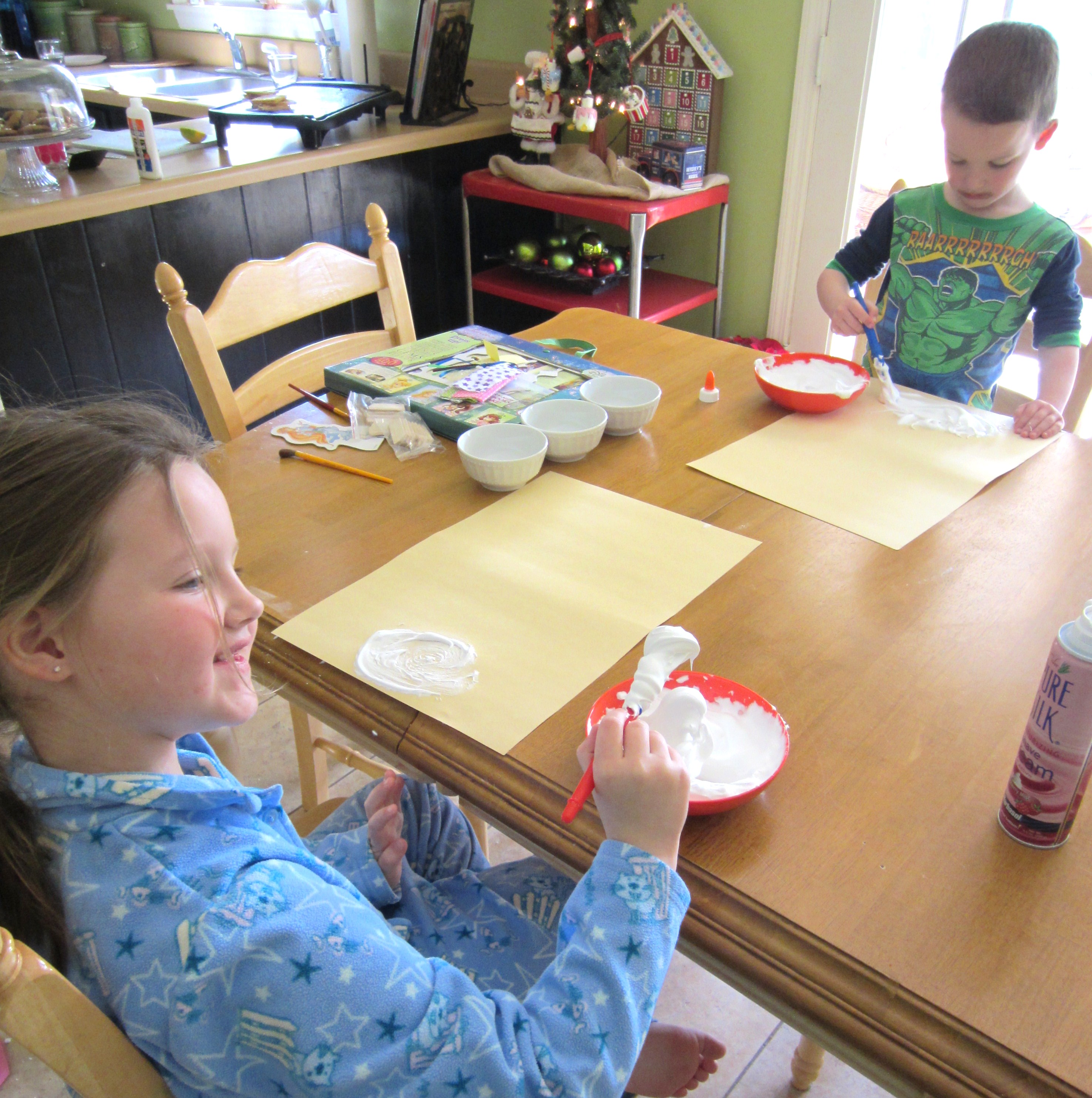 A and G mixed equal parts glue and shaving cream to make snowman puffy paint (thanks, pinterest!)