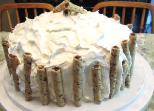 Miss April is a three layer white cake with sour cream coconut filling topped with cool whip (yes the chemical kind) and she gets so much better the longer the filling soaks into the cake.