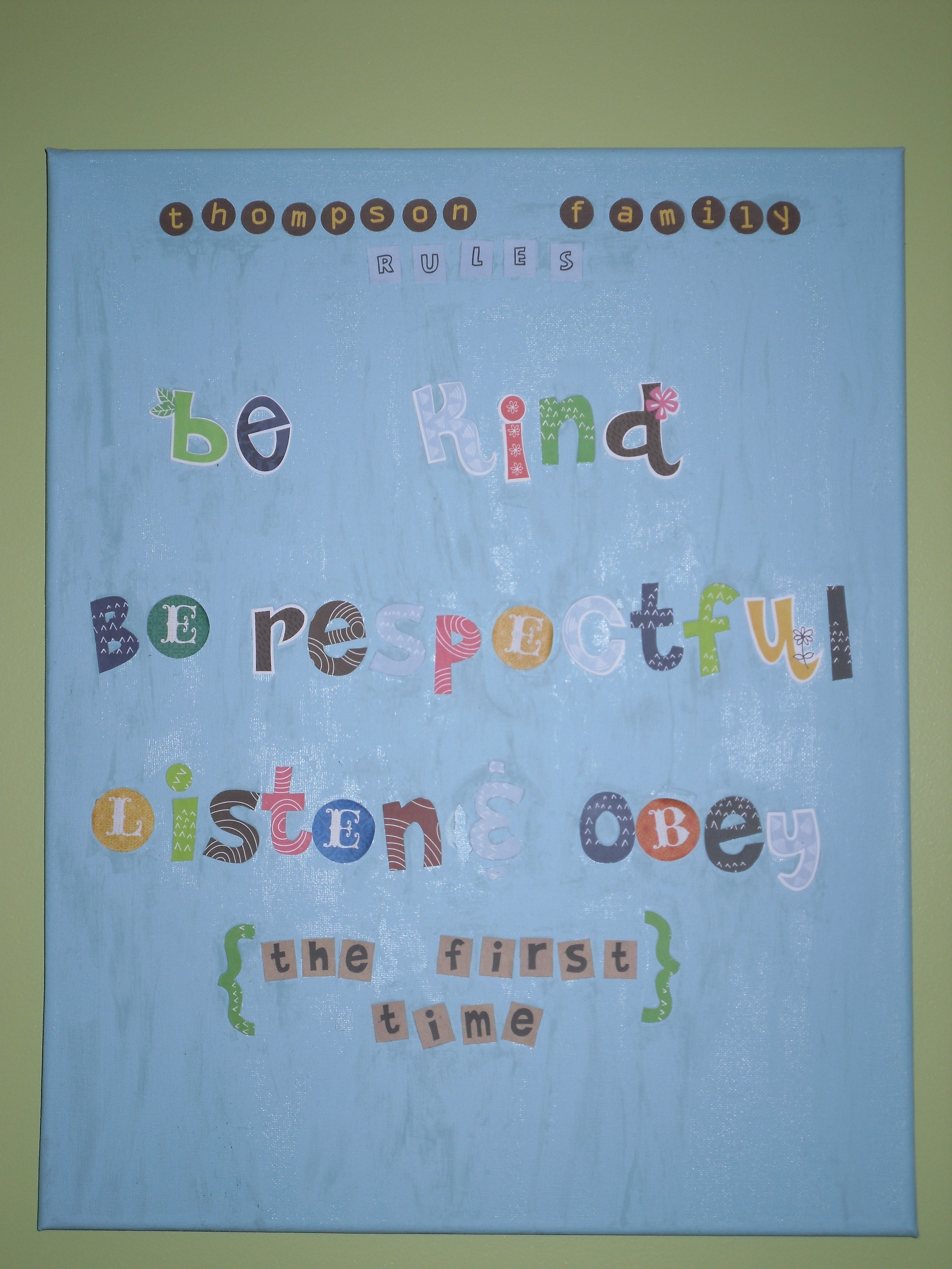 Day 4 of mommy and me summer fun. I love that I get to be a stay at home mom for eight weeks in the summer! It’s also much harder than working with hundreds of other children for 10 months during the school year. After several meltdowns, a few even from the kids, I decided to whip this up for our kitchen. I painted a canvas and used Ava’s leftover school glue to adhere scrapbook letters. It reads: Thompson Family Rules, Be Kind, Be Respectful, Listen & Obey the first time. One large iced tea and a little crafty, and I’m refocused on Summer Lovin’ these babies that are gifts from God. It’s crooked and streaky but perfect for our family- much like design narrative.
